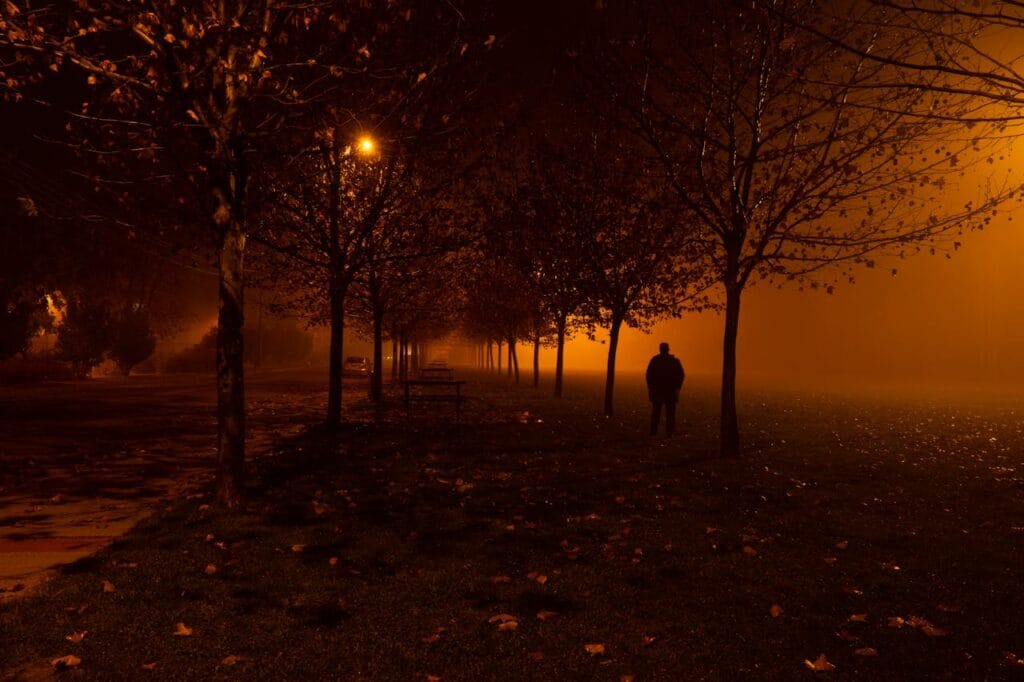 The kind of sky that cannot decide between blue and grey, with just enough faint light at the edges to remind you it was recently summer. The street lamps were on. I had found a bench slightly away from the nearest one, which was exactly where I wanted to be.